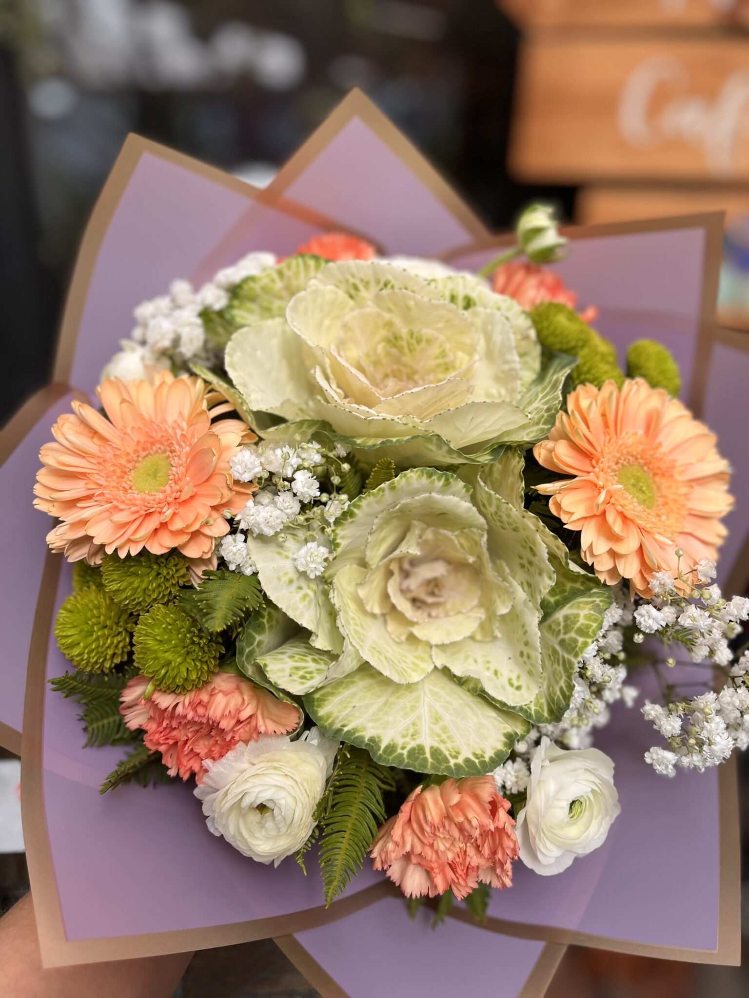 Un precioso arreglo con con flores frescas del Día. Este ramo va variando según las flores disponibles en tienda prefiriendo siempre las variedades recién llegadas.
