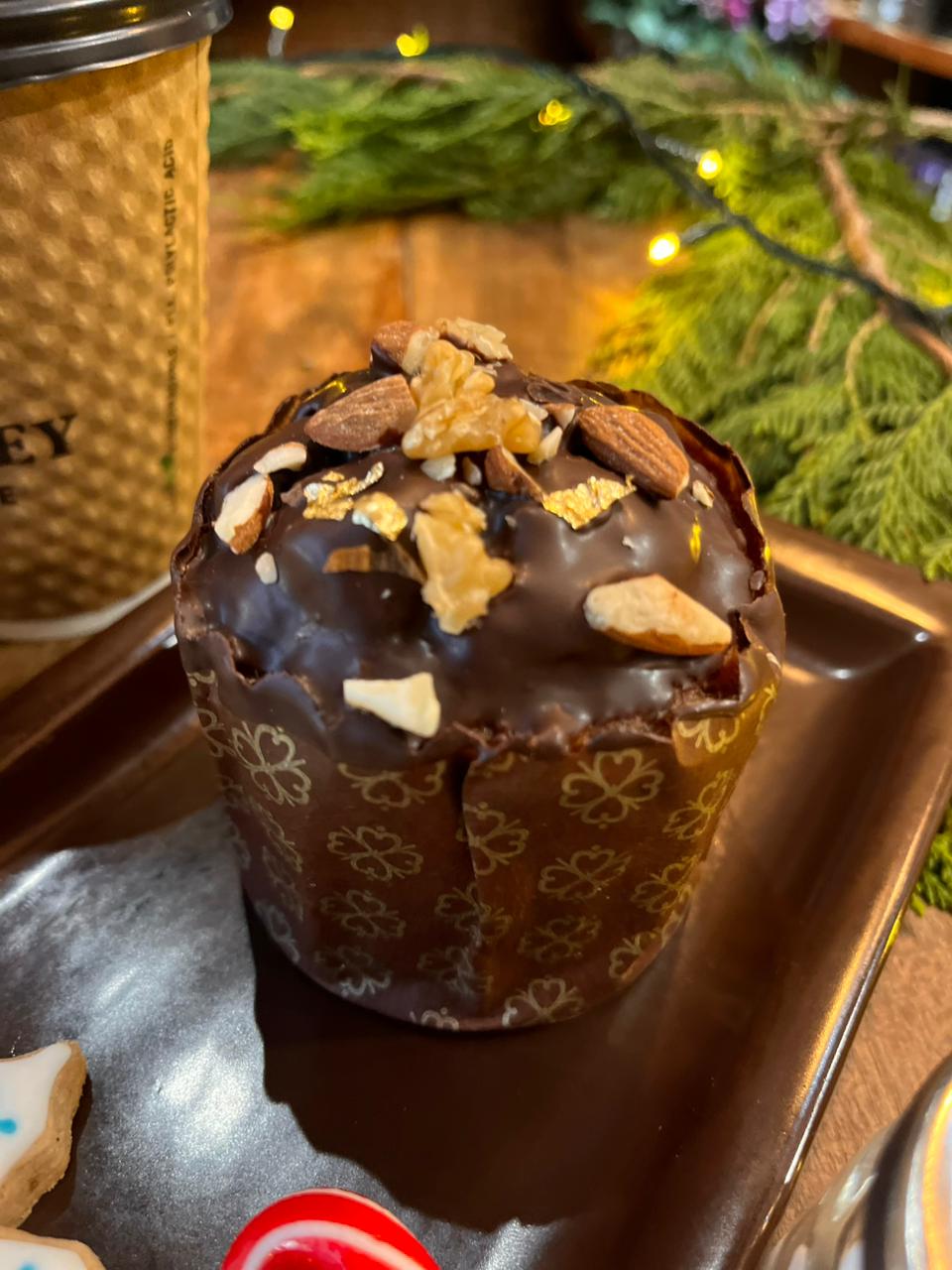 2 panes de pascua premium Dairola, con cobertura de chocolate, delicada decoración de frutos secos y toques de papel de oro