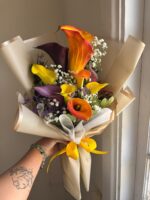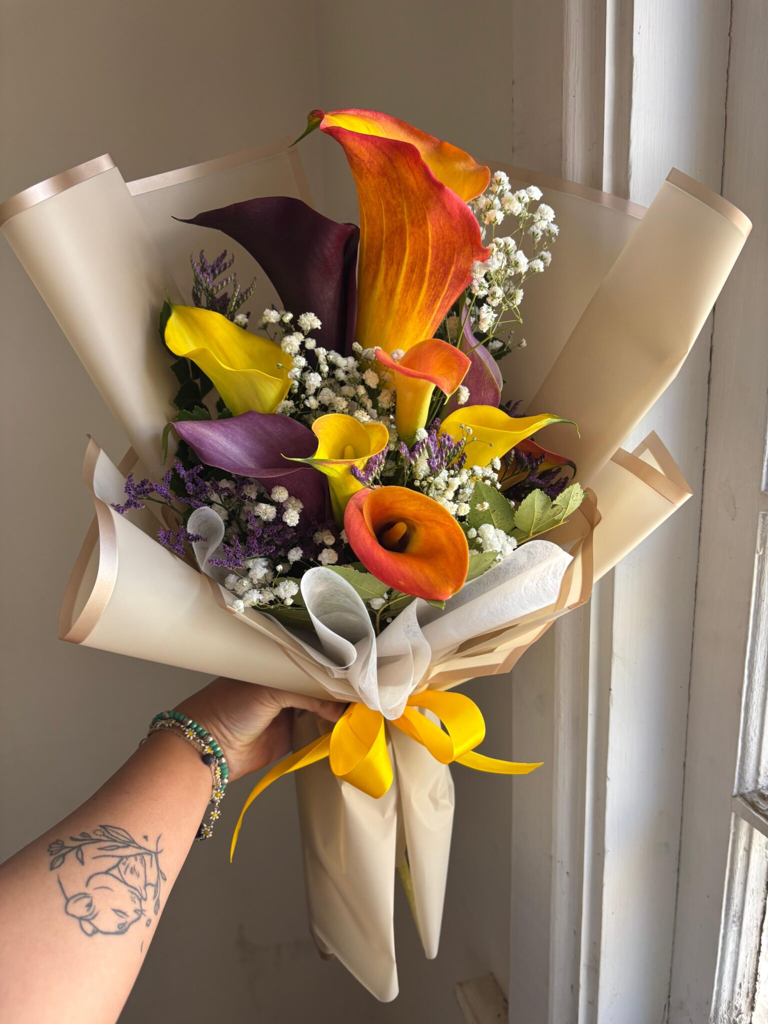 Celebra la belleza de lo simple con nuestro Ramo “Calas Arcoíris”, un delicado arreglo compuesto por 9 calas coloridas, seleccionadas por su elegancia natural y su vibrante intensidad. Cada flor destaca por su forma estilizada y colores únicos, creando un bouquet moderno, fresco y lleno de vida.