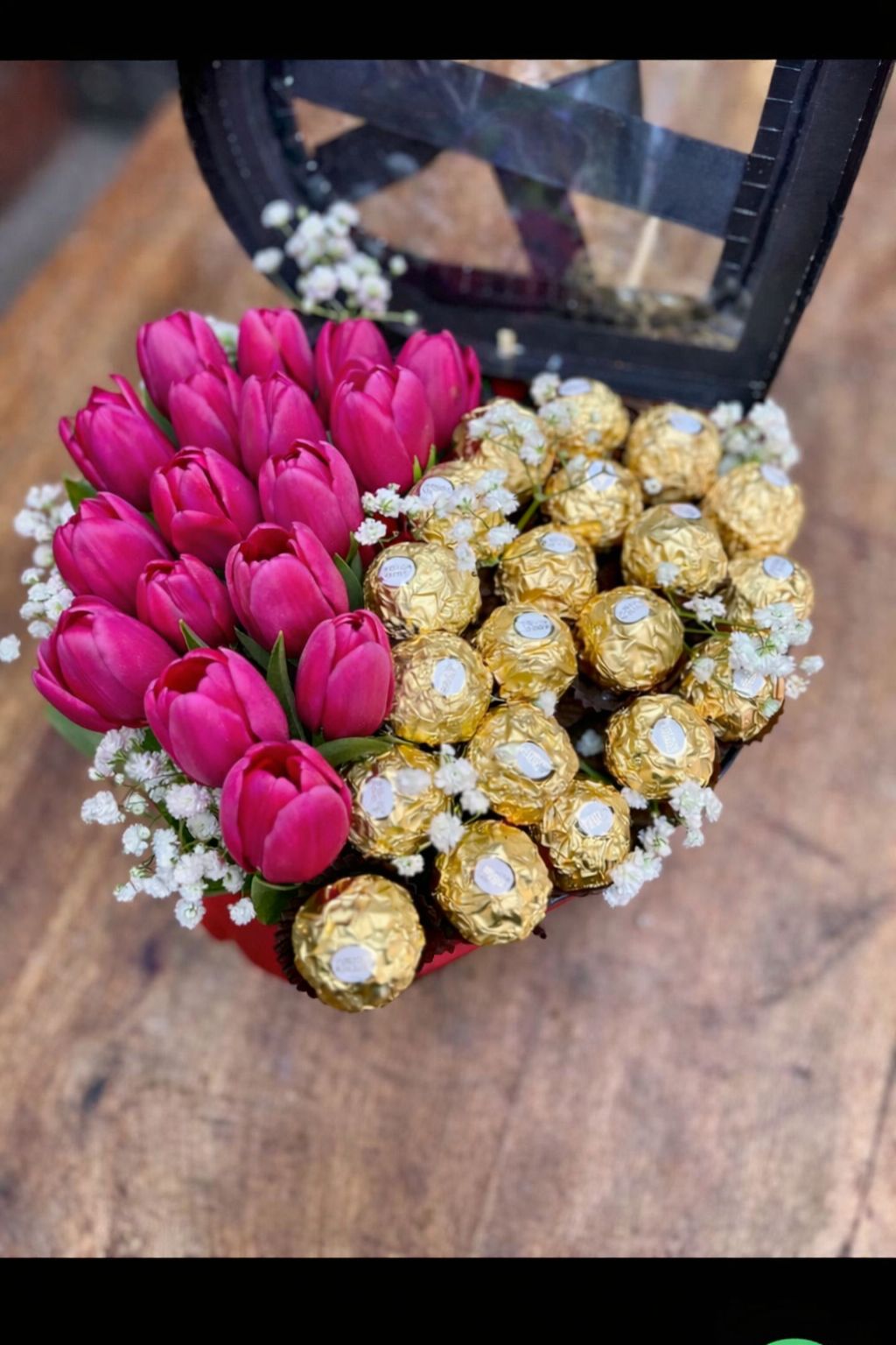 Una caja con forma de corazón diseñada para decir «te quiero», «te amo» o «estoy pensando en ti» sin necesidad de palabras. Este arreglo combina lo mejor de dos mundos: la belleza fresca de los tulipanes y la dulzura irresistible de los bombones Ferrero, creando un regalo equilibrado, delicado y lleno de intención.