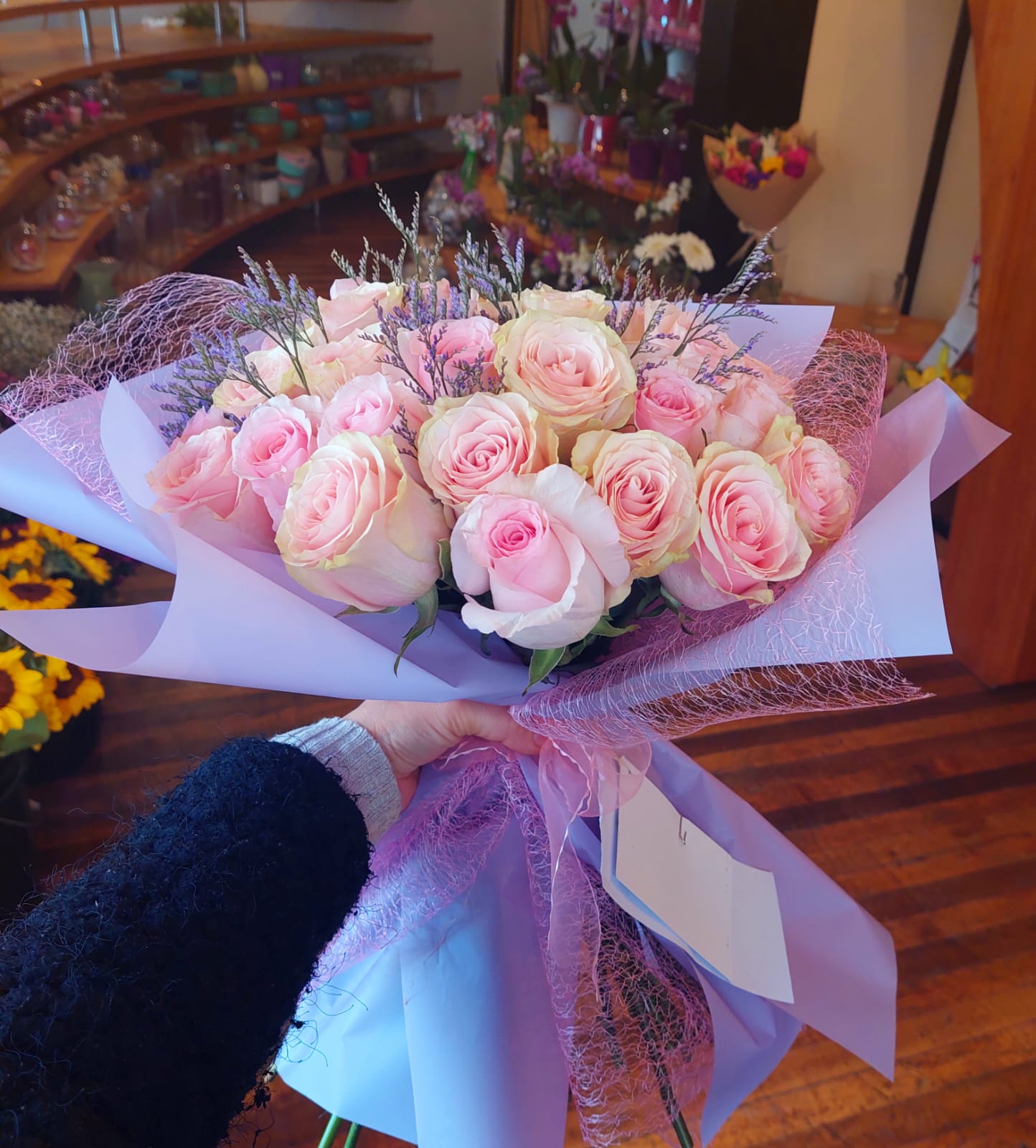 El precio original era: $ 49,900$ 39,900El precio actual es: $ 39,900Ramo de Rosas Rosadas y Lisianthus