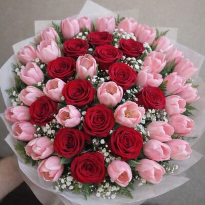 Un arreglo floral de carácter sofisticado, creado para celebrar el amor con elegancia y profundidad. Este ramo redondo une la fuerza simbólica de las rosas rojas con la belleza serena de los tulipanes, logrando una composición armónica, refinada y atemporal.