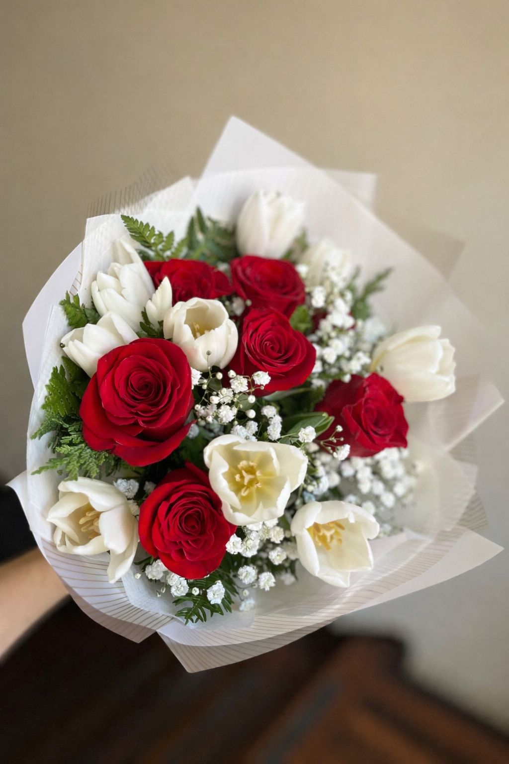 Cada flor es seleccionada cuidadosamente para asegurar frescura, textura y equilibrio visual. Las rosas aportan intensidad y pasión, mientras los tulipanes suavizan el conjunto con líneas delicadas y un aire contemporáneo. El color de las rosas y los tulipanes puede elegirse entre variados colores, permitiendo personalizar el mensaje y la emoción que se desea transmitir.