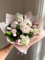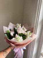 Elegante ramo de 15 tulipanes y 4 peonias de temporada acompañado de alelies en tonos pasteles.
