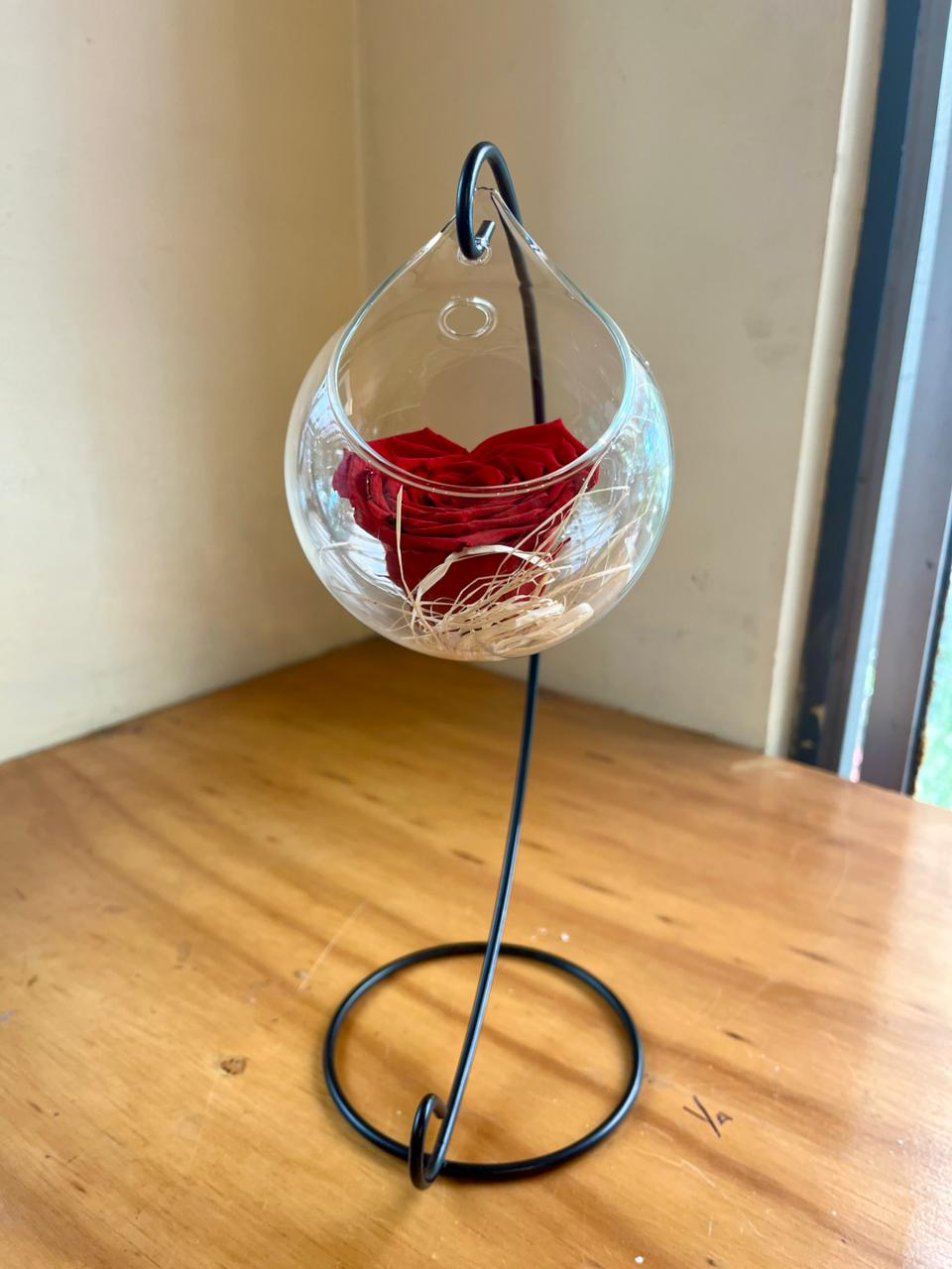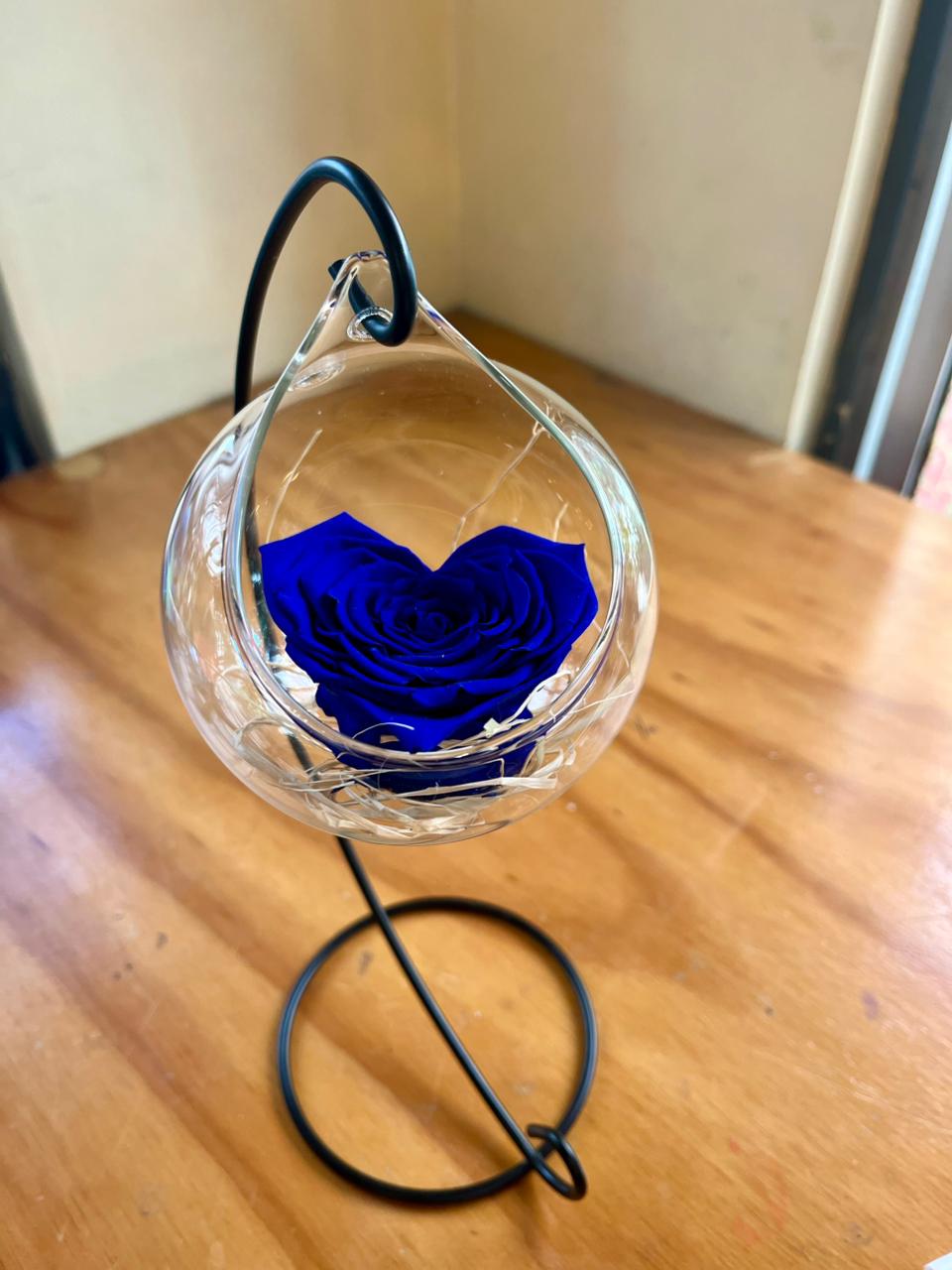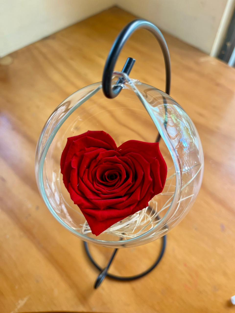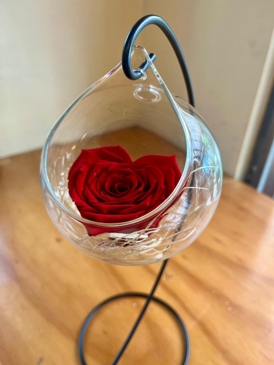 Rosa preservada con delicada forma de corazón, símbolo de amor eterno y detalles que perduran en el tiempo. Acompañada de elegantes elementos decorativos y presentada en una fina base de vidrio. Disponible en distintos colores para que elijas el que mejor represente tu historia de amor.
